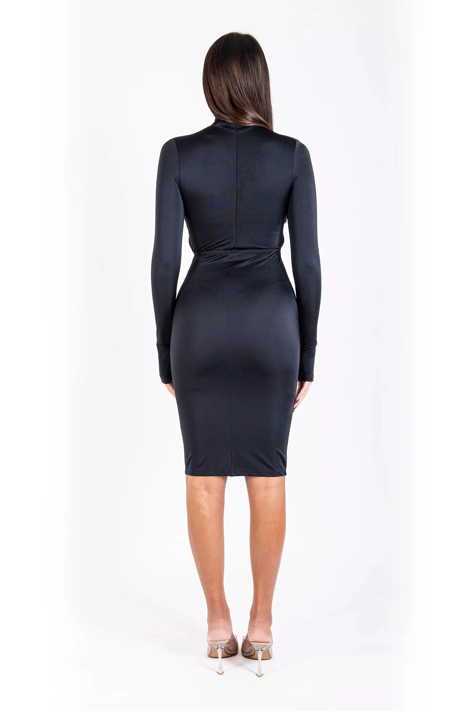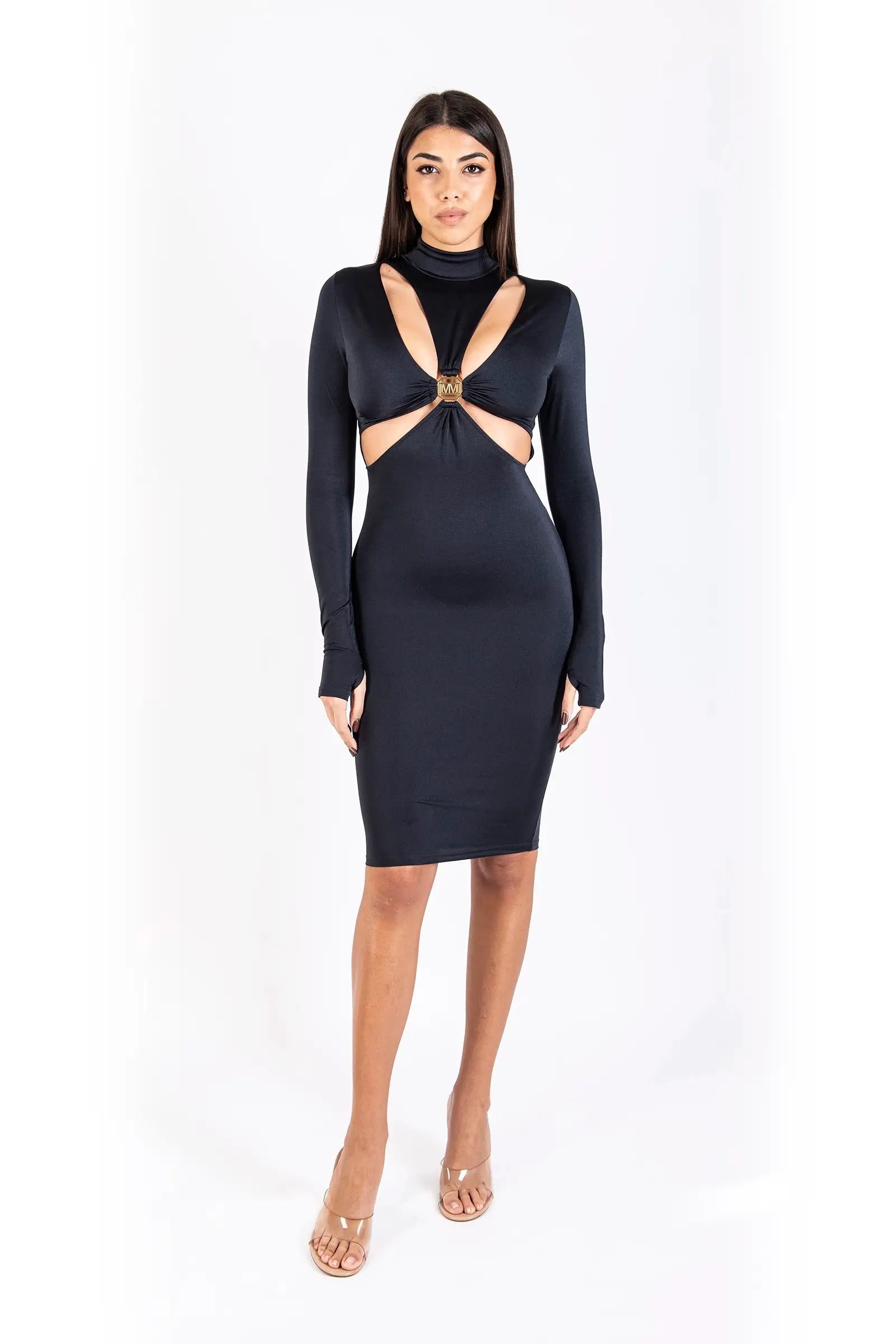 Abito longuette collo alto manica lunga con accessorio oro