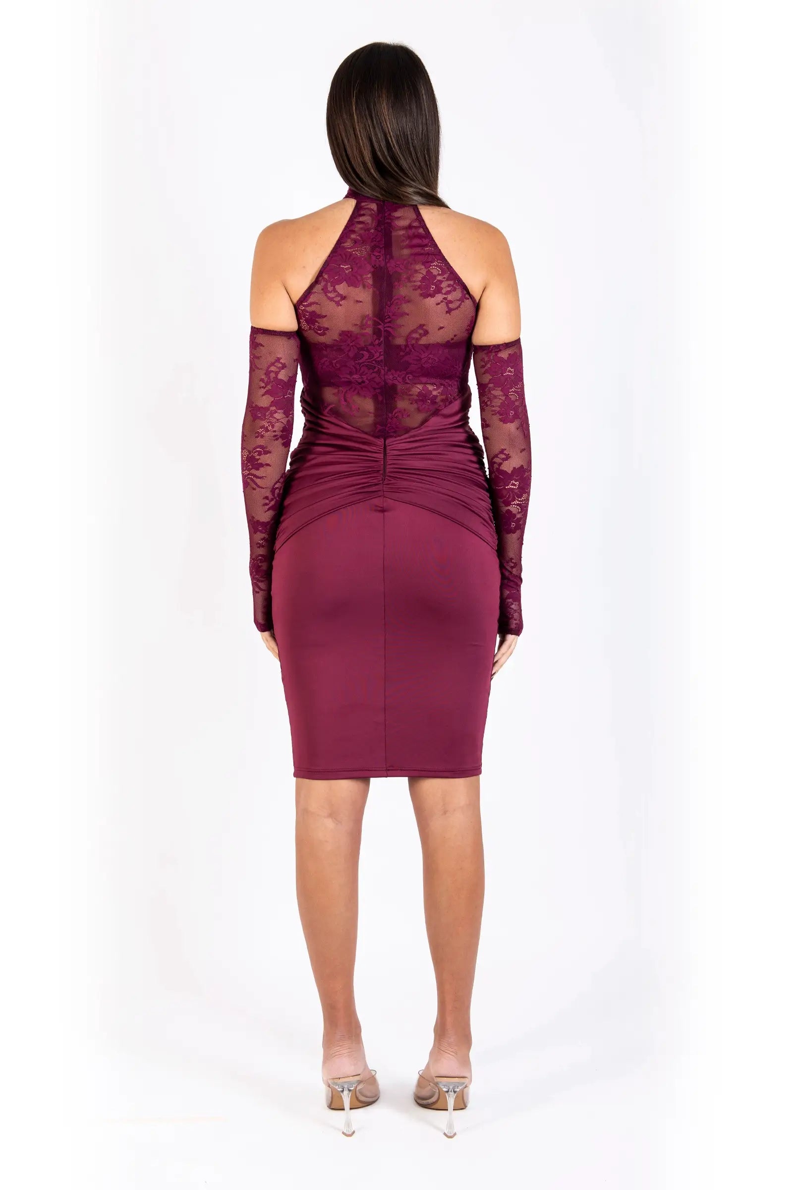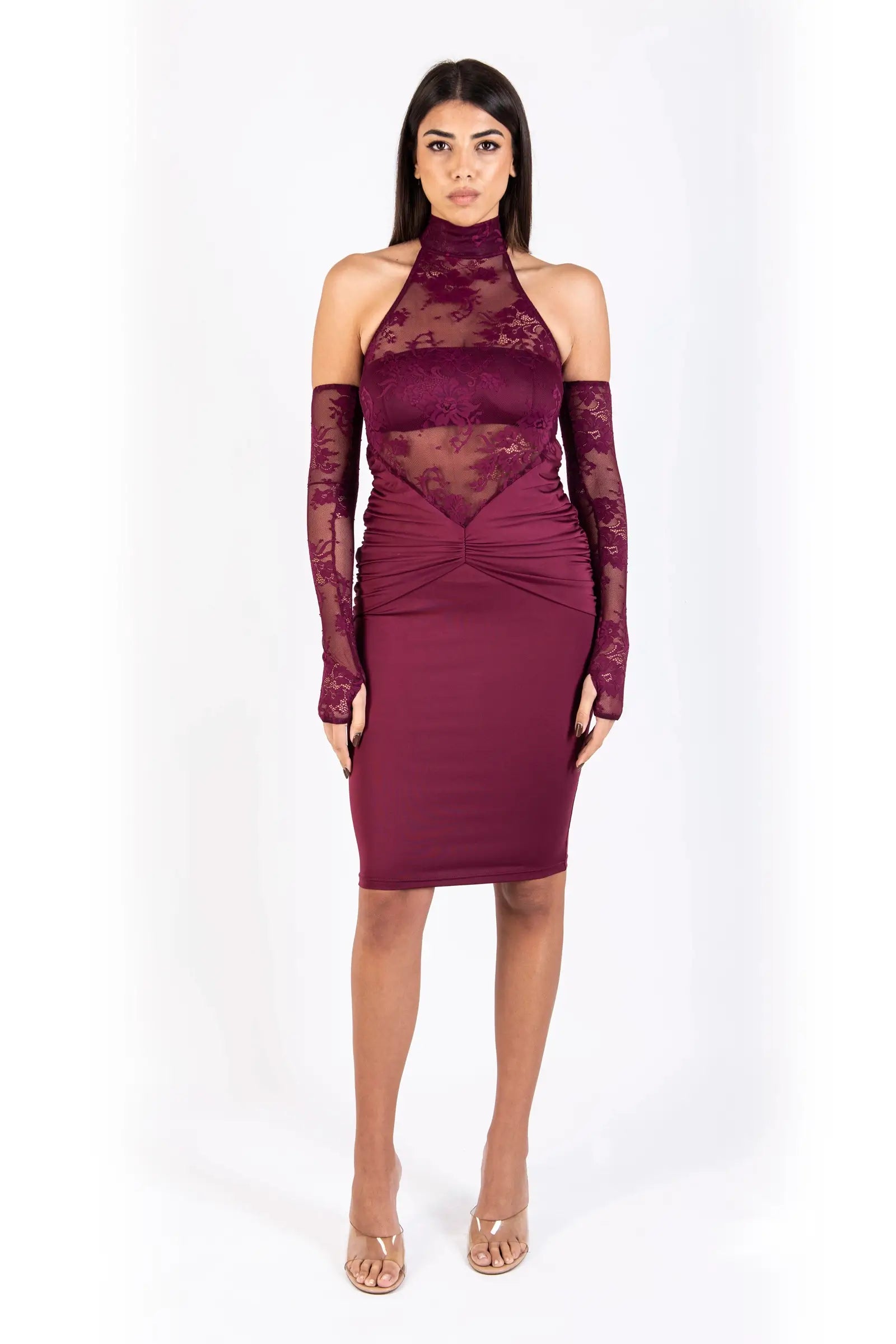 Abito midi in lycra scollo americano, collo alto e guanti.