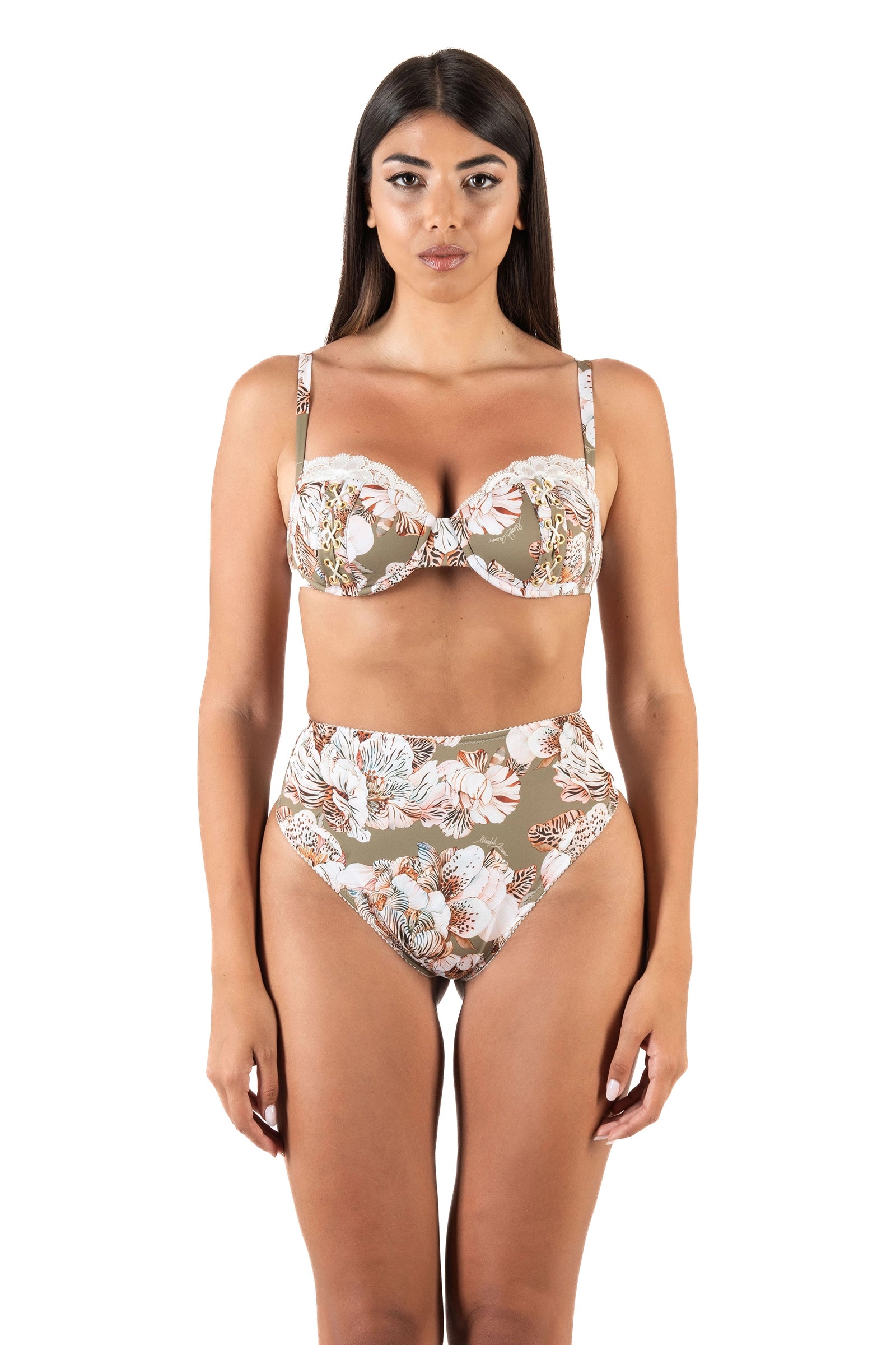 Reggiseno balconette con pizzo e lavorazioni di occhielli passanti oro. Slip coulotte brasiliana fantasia