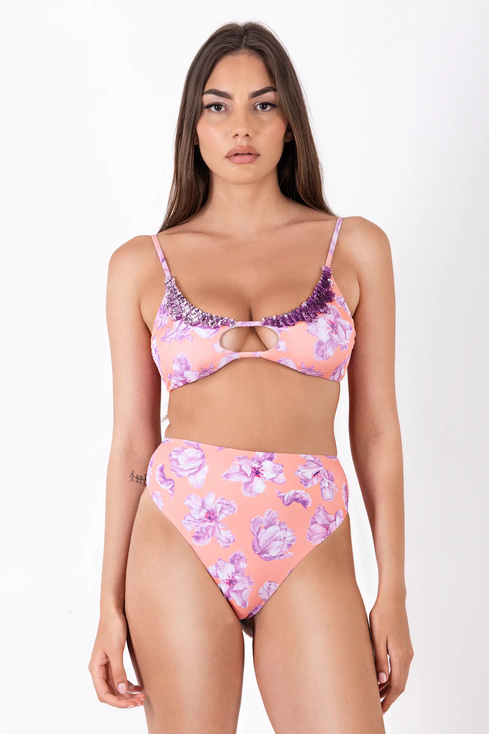 Reggiseno brassiere fantasia con ricamo a mano. Slip coulotte fantasia