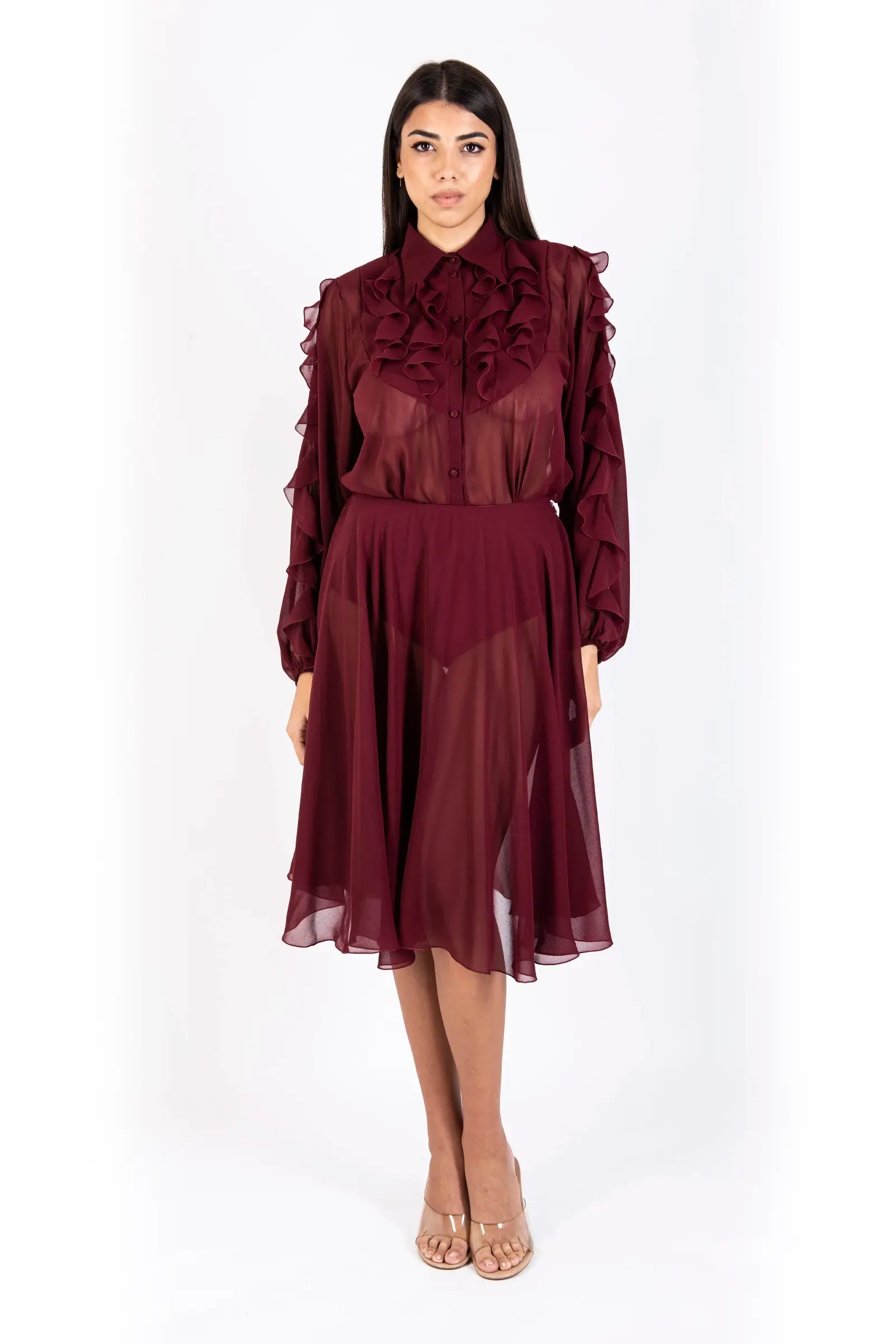 Camicia manica lunga con rouches e bottoni. Gonna a ruota con lampo e coulotte in lycra.