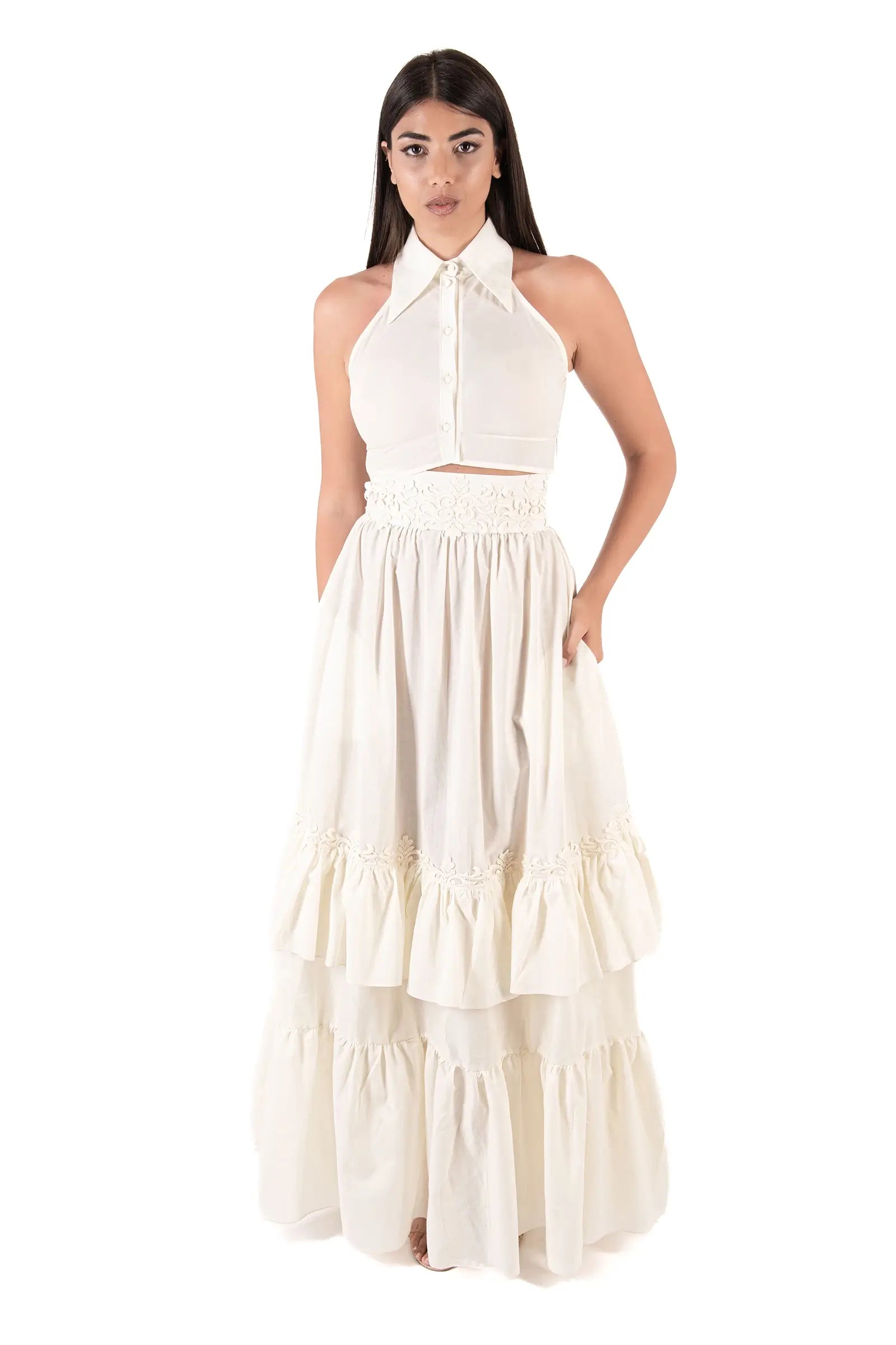 Coordinato camicia crop giro manica e gonna lunga balze con applicazioni macramè